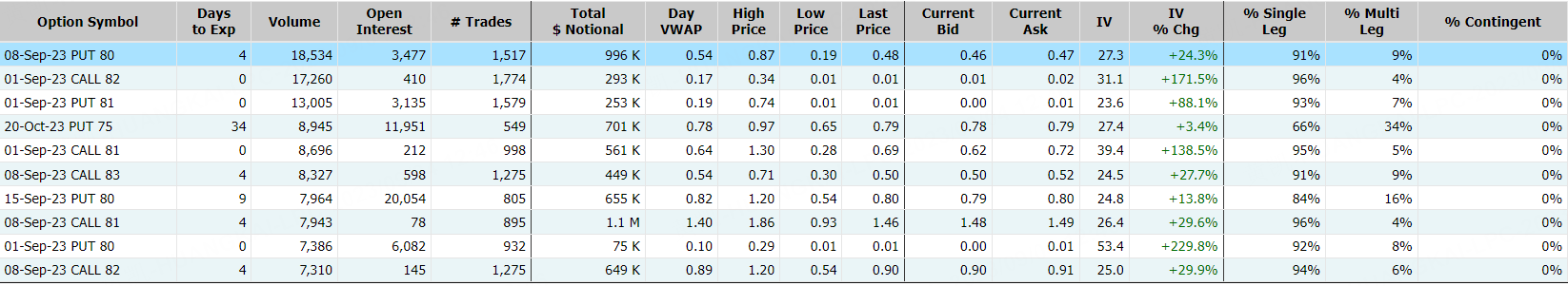 迪士尼上周五跌超2%,期权合约成交38.15万张。9月8日到期的80美元的行权看跌期权交易量特别高,共有18,534份合约交易。 $DIS 20230908 80.0 PUT$