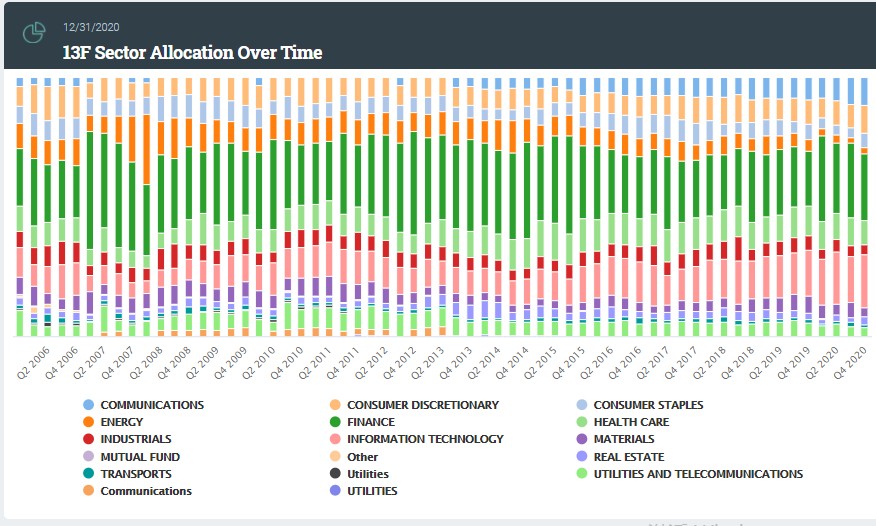 从持仓偏好来看,自2002年以来,金融类、IT、及消费标的在大多时期都占巴克莱银行仓位重头。