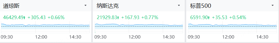 截至收盘,标普500指数涨0.54%,报6591.90点;纳斯达克综合指数涨0.77%,报21929.83点;道琼斯工业平均指数涨0.66%,报46429.49点。