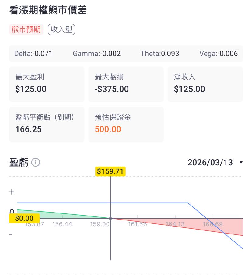 适用观点:看好财报表现,预期股价将上涨,但认为短期突破$160阻力位存在压力,希望以明确且有限的成本参与上涨行情。