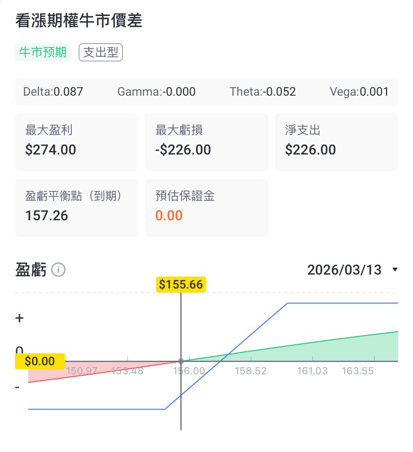 成本可控:通过卖出$160 Call获得权利金,大幅抵消买入$155 Call的成本,将净支出降至 $2.26/股。