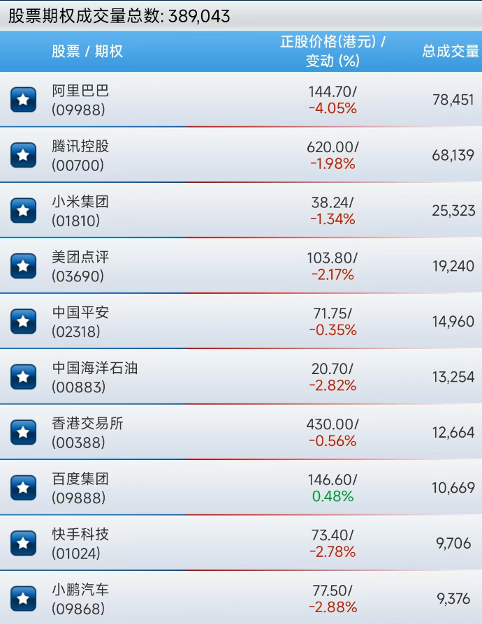 港股股票期权上午成交389043张合约。阿里巴巴成交量居首,腾讯、小米、美团等紧随其后。