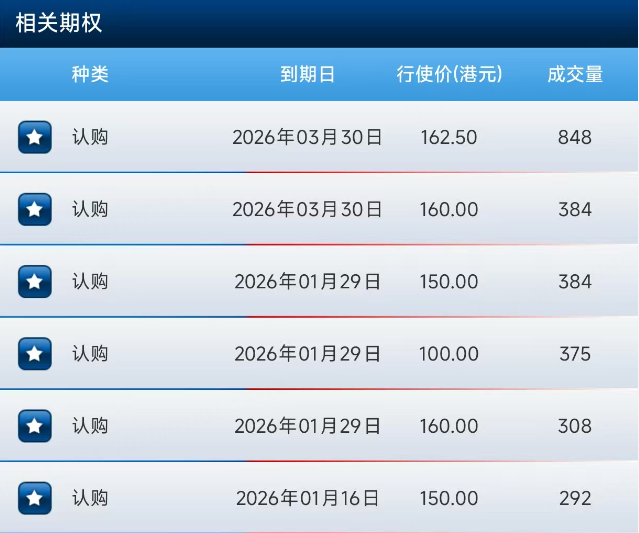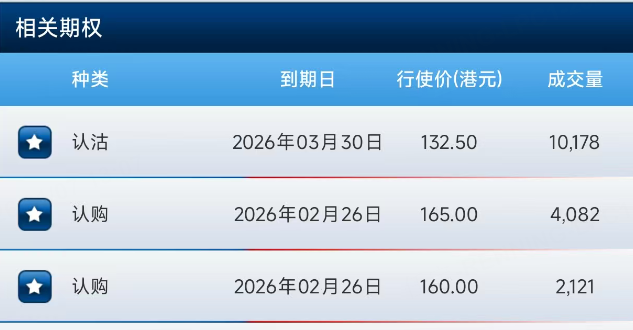 期权方面,阿里上午排名第二、第三位的均是认购合约,同样是2月26日到期,行权价分别为165、160港元。