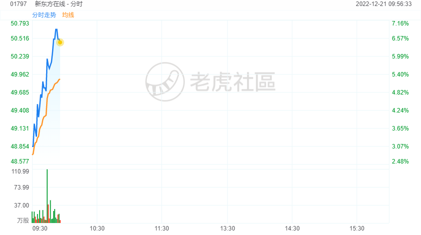 12月21日,新东方在线涨超6%,报50.6港元再创新高;其他港股教育股拉升,思考乐教育涨超15%,光正教育涨近14%,新东方-S涨5.2%。