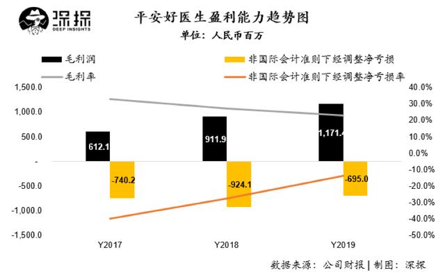 在盈利方面,平安好医生2019年取得毛利润11.71亿元人民币,同比增长仅为28.5%,远低于收入51.8%的增长率。公司毛利率2019年仅为23.1%,在过去三年呈现持续下降趋势。