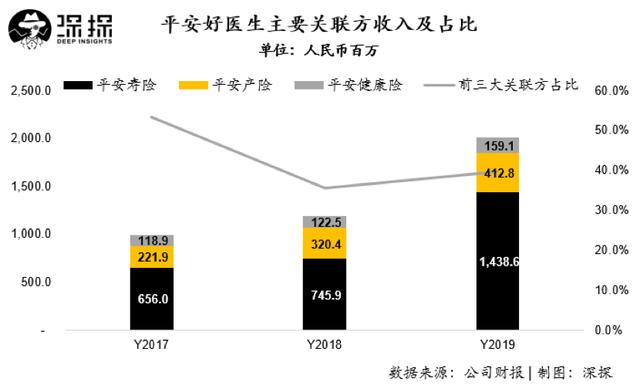平安系内的前三大客户平安寿险、平安产险和平安健康险三家合计为平安好医生贡献收入超过20亿元人民币,占总收入比接近40%,而这一比例也超过了2018年的35.6%。
