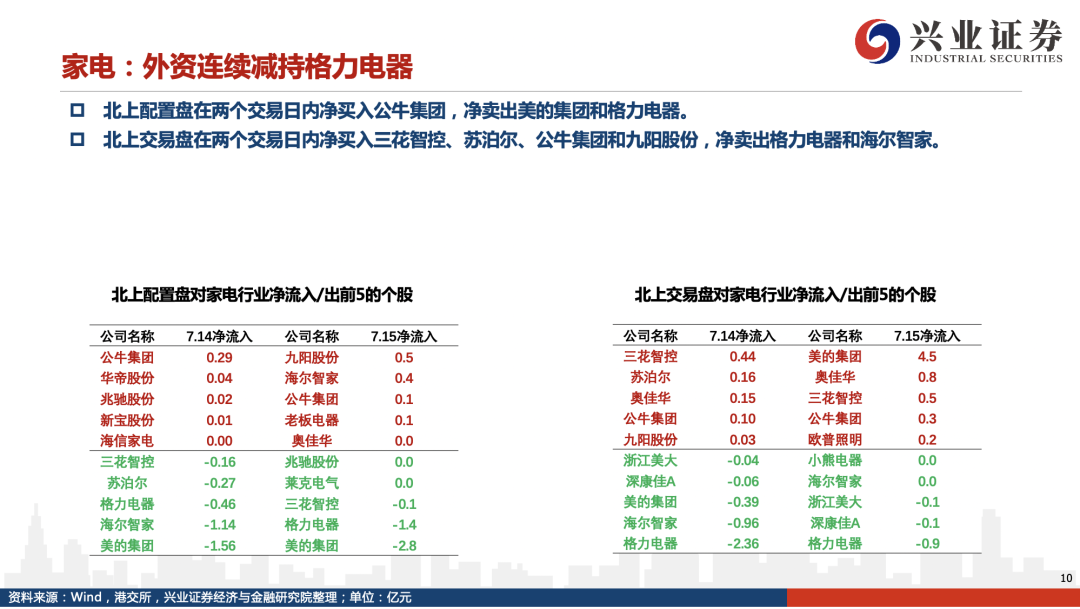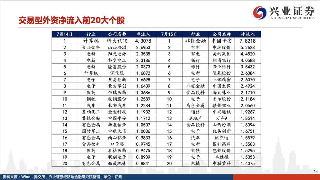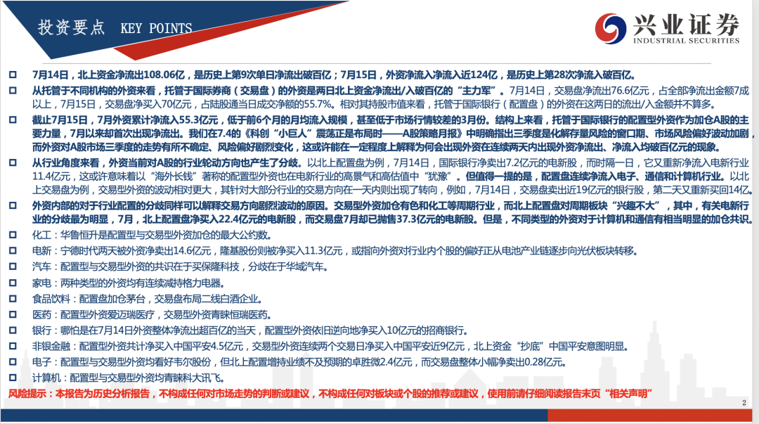 截止7月15日,7月外资累计净流入55.3亿元,低于前6个月的月均流入规模,甚至低于市场行情较差的3月份。结构上来看,托管于国际银行的配置型外资作为加仓A股的主要力量,7月以来却首次出现净流出。我们在7.4的《科创“小巨人”震荡正是布局时——A股策略月报》中明确指出三季度是化解存量风险的窗口期、市场风险偏好波动加剧,而外资对A股市场三季度的走势有所不确定、风险偏好剧烈变化,这或许能在一定程度上解释为何会出现外资在连续两天内出现外资净流出、净流入均破百亿元的现象。