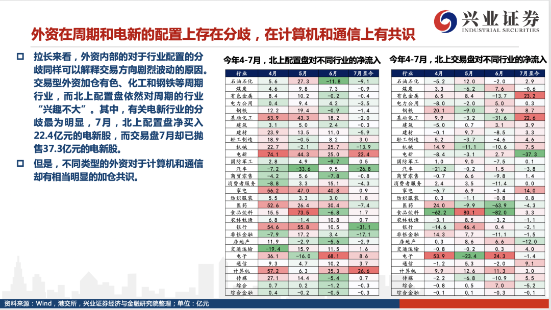 外资内部的对于行业配置的分歧同样可以解释交易方向剧烈波动的原因。交易型外资加仓有色和化工等周期行业,而北上配置盘对周期板块“兴趣不大”,其中,有关电新行业的分歧最为明显,7月,北上配置盘净买入22.4亿元的电新股,而交易盘7月却已抛售37.3亿元的电新股。但是,不同类型的外资对于计算机和通信有相当明显的加仓共识。