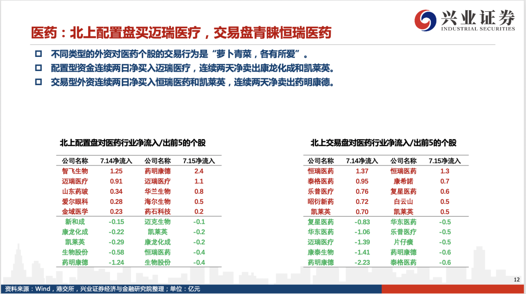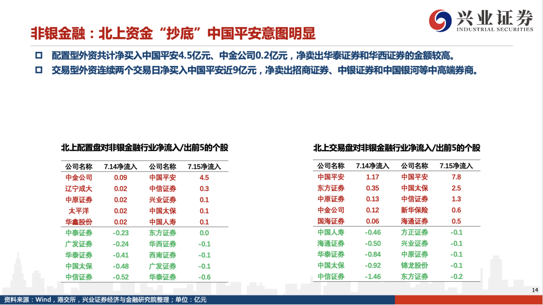银行:哪怕是在7月14日外资整体净流出超百亿的当天,配置型外资依旧逆向地净买入10亿元的招商银行。