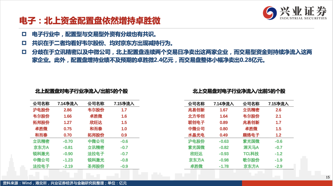 电子:配置型与交易型外资均看好韦尔股份,但北上配置增持业绩不及预期的卓胜微2.4亿元,而交易盘整体小幅净卖出0.28亿元。