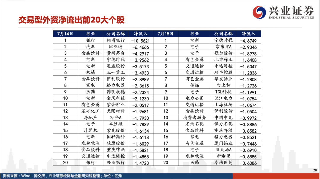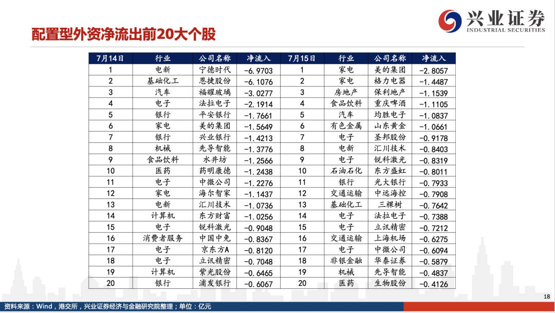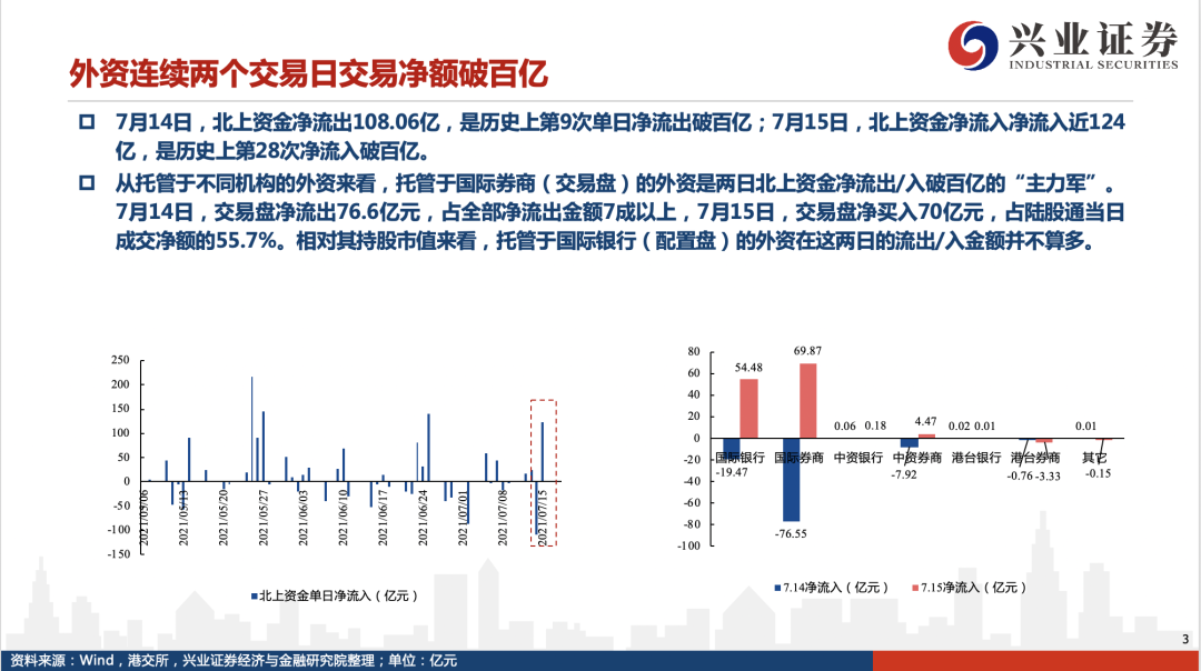 7月14日,北上资金净流出108.06亿,是历史上第9次单日净流出破百亿;7月15日,外资净流入净流入近124亿,是历史上第28次净流入破百亿。