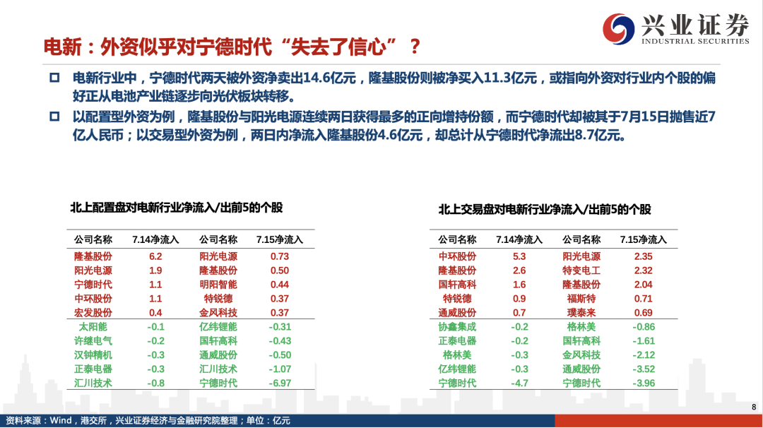 电新:宁德时代两天被外资净卖出14.6亿元,隆基股份则被净买入11.3亿元,或指向外资对行业内个股的偏好正从电池产业链逐步向光伏板块转移。