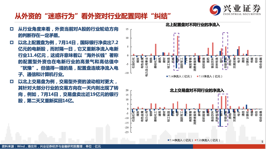 从行业角度来看,外资当前对A股的行业轮动方向也产生了分歧。以北上配置盘为例,7月14日,国际银行净卖出7.2亿元的电新股,而时隔一日,它又重新净流入电新行业11.4亿元,这或许意味着以“海外长钱”著称的配置型外资也在电新行业的高景气和高估值中“犹豫”。但值得一提的是,配置盘连续净流入电子、通信和计算机行业。以北上交易盘为例,交易型外资的波动相对更大,其针对大部分行业的交易方向在一天内则出现了转向,例如,7月14日,交易盘卖出近19亿元的银行股,第二天又重新买回14亿。