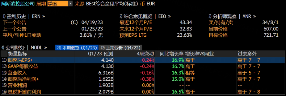 根据彭博一致预期,阿斯麦一季度营收为63.16亿欧元,调整后净利润为16.22亿欧元,调整后EPS为4.14欧元。
