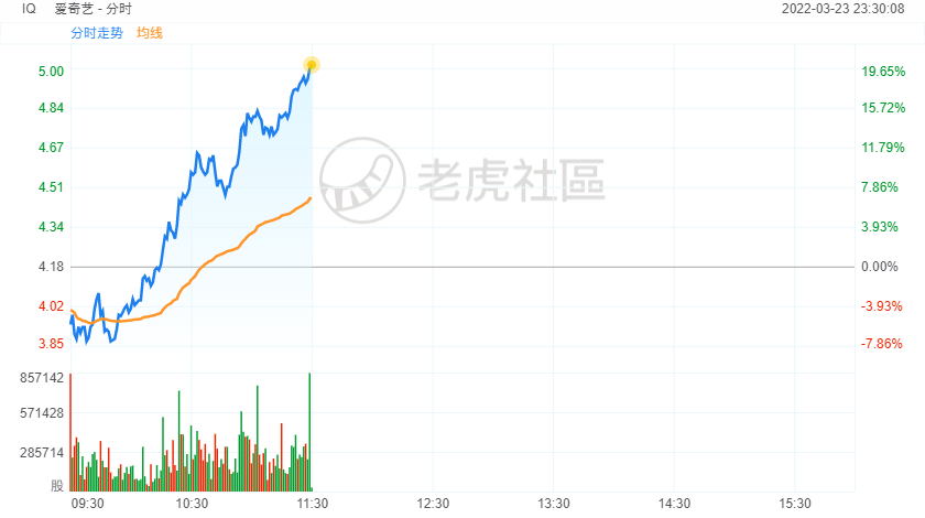 3月23日,部分中概股涨幅扩大,爱奇艺涨超20%,拼多多、万国数据涨超12%,哔哩哔哩、好未来涨超9%,腾讯音乐涨超8%,虎牙、贝壳、达达集团涨超6%,阿里巴巴涨超5%。