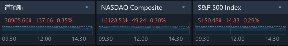 美东时间周四,三大指数集体收跌,此前公布的新一轮美国通胀数据全面超出预期。截至收盘,道琼斯指数跌0.35%,报38905.66点;标普500指数跌0.29%,报5150.48点;纳斯达克指数跌0.30%,报16128.53点。