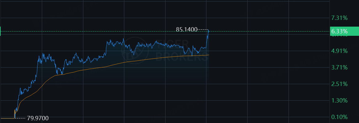 周一,现货白银站上85美元/盎司,创历史新高,涨幅超6%。现货黄金涨超2%,同样创历史新高。