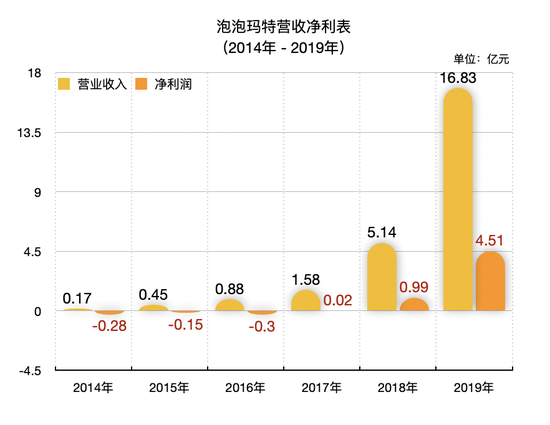 招股书显示,2017年至2019年,泡泡玛特实现营收1.58亿、5.15亿、16.83亿;实现净利润156.90万元、9952.10万元、45111.80万。2019年的营收同比上年增长226.80%,净利同比增长353.29%。