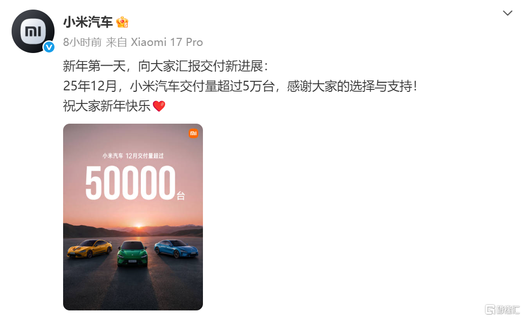 小米汽车12月交付量超5万台,产品矩阵扩张计划同步曝光。据产业端信息,其2026年拟推出4款新车,包括SU7改款、SU7行政版,以及一款增程五座SUV和一款增程七座SUV,其中SU7改款与增程七座SUV计划上半年推出,另外两款则安排在下半年至年底亮相。