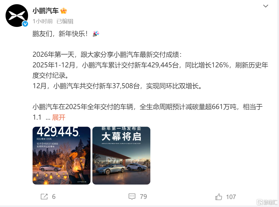 小鹏汽车12月交付37508辆,实现同环比双增长;全年累计交付429445辆,同比增幅高达126%,刷新历史年度交付记录。