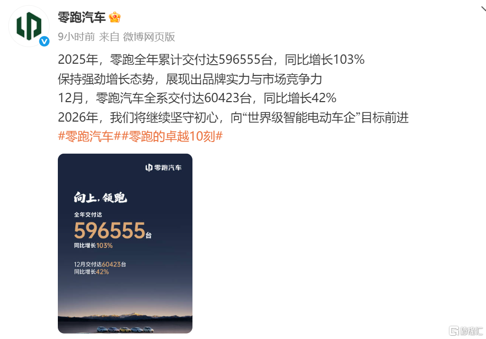 零跑汽车12月全系交付60423台,同比增长42%;全年累计交付596555台,同比增幅达103%。