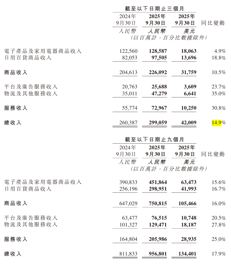 京东 :2025年第三季度收入2991亿元人民币,同比增长14.9%。归属于公司普通股股东的净利润为53亿元,2024年同期为117亿元。非美国通用会计准则下净利润为58亿元,2024年同期为132亿元。三季度调整后EBITDA 25亿元,同比下降83%,市场预估34.1亿元。