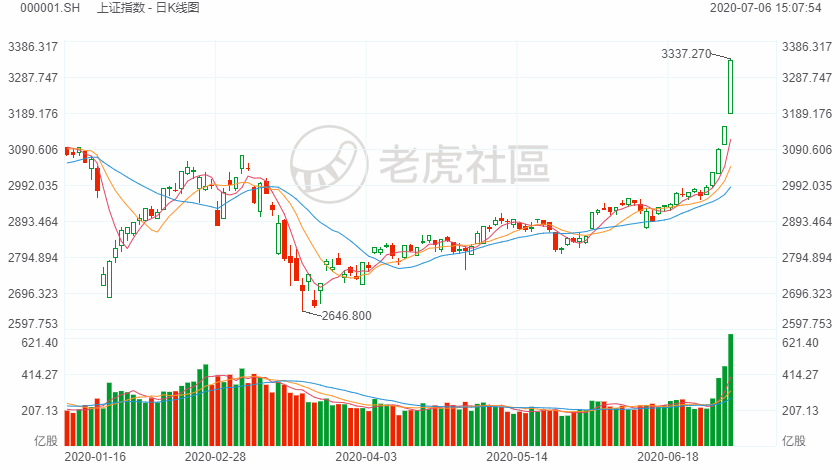 7月6日讯,指数高开高走,单边上行,沪指大涨近6%,创2年半新高,两市成交量逾1.5万亿,创5年新高,市场情绪极度亢奋,逾200股涨停。板块上,大金融板块迎一致性预期,券商、银行板块指数逼近涨停,集体掀涨停潮,保险、煤炭、房地产、有色金属等低位权重板块继续走强,免税题材持续活跃,半导体板块持续拉升,中芯国际概念指数涨停,整体上,市场板块普涨,增量资金加速入场,低位周期继续补涨,市场依旧围绕大金融、免税、半导体三大主线,指数全天持续逼空。