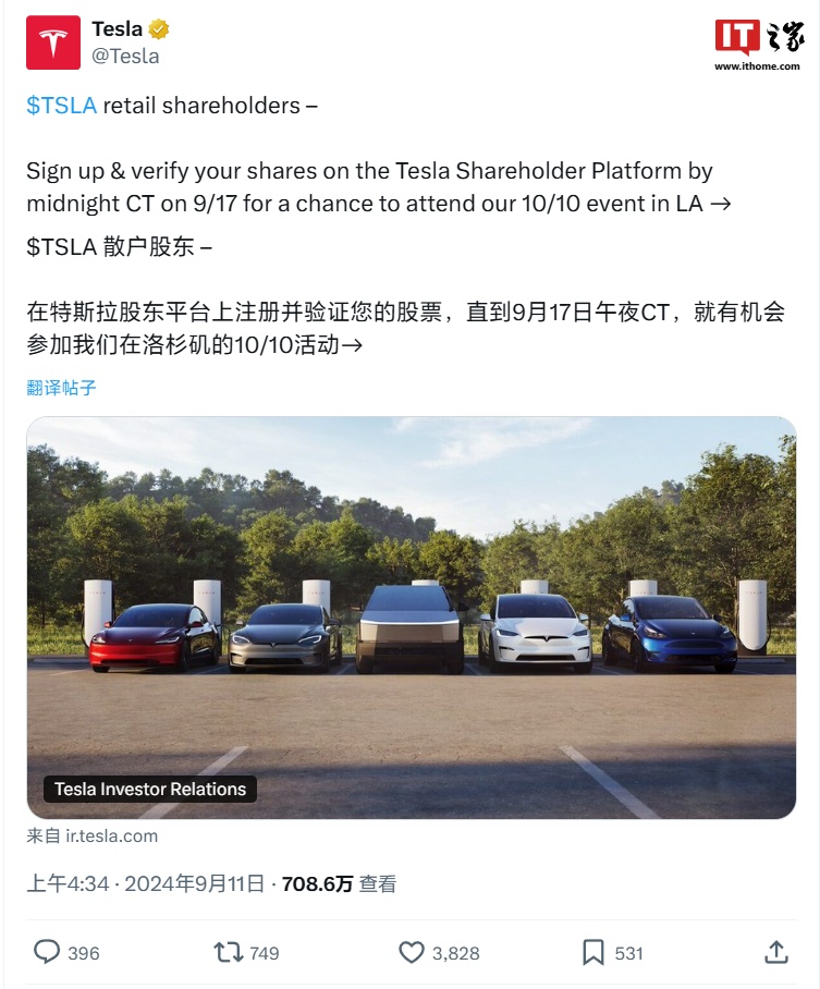 特斯拉官方 X 账号今天发文宣布,将于当地时间 10 月 10 日在洛杉矶举办活动,并面向股东开展门票抽奖活动。
