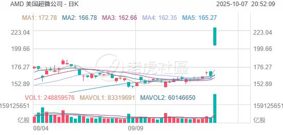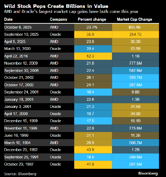 美国超微公司 公司周一也经历了这样的“火箭式”上涨。这家芯片制造商与OpenAI达成交易后,股价飙升,盘中高位时公司市值一度增加约1000亿美元;该协议可能为其带来数十亿美元的营收。此前,甲骨文公司上月曾单日大涨36%,一日之间为这家软件公司的市值增加了2550亿美元,起因是其对云业务给出了尤为强劲的指引,其中包括与OpenAI达成的一项为期五年、价值3000亿美元的协议。