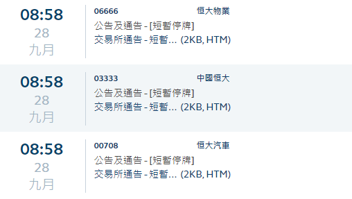9月28日早间,恒大系旗下上市公司中国恒大、恒大汽车、恒大物业在香港交易所集体暂停交易。