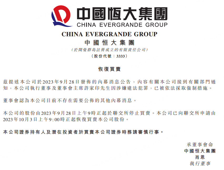9月28日,中国恒大在港交所公告,公司接到有关部门通知,公司执行董事及董事会主席许家印先生因涉嫌违法犯罪,已被依法采取强制措施。