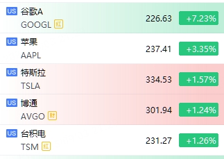 热门科技股多数上涨,谷歌涨超7%,苹果涨超3%,特斯拉、博通、台积电涨超1%;