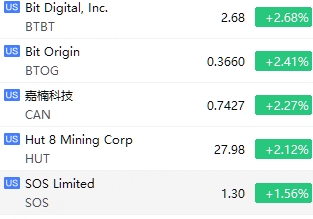 加密货币集体上行,Bit Digital、Bit Origin、嘉楠科技涨超2%。