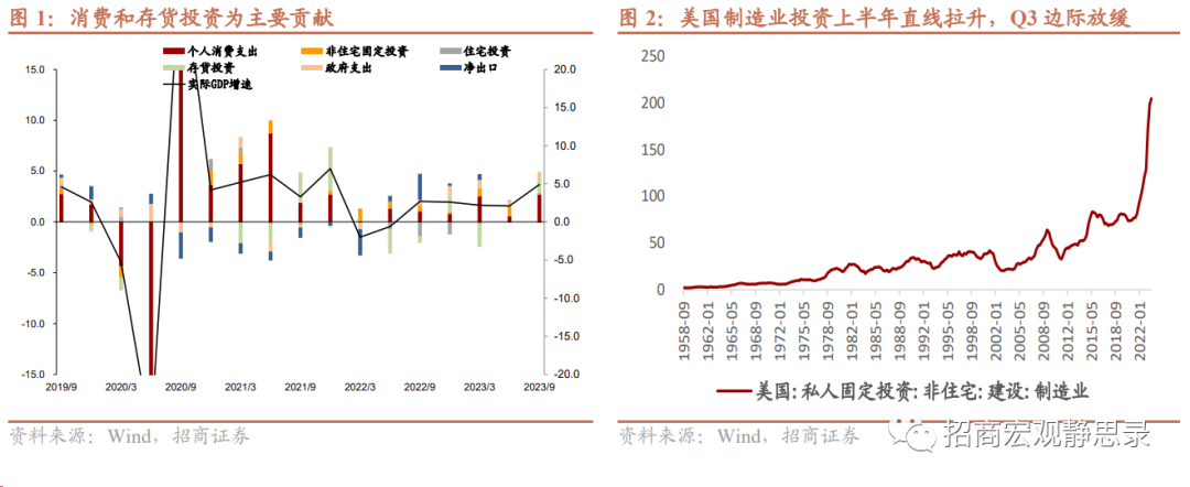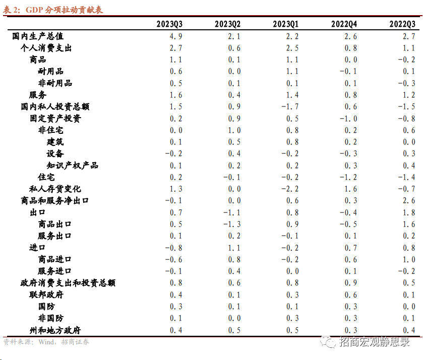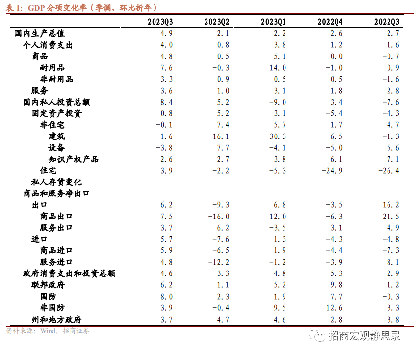 值得注意两点:1)去年10月通过的《2023纳税年度税收通货膨胀调整》将纳税标准扣除额提高了约7%,2023年1月开始执行拉动今年美国个人消费支出(名义值)多增1-1.8%;2)换算成同比,Q3实际经济增速为2.9%。