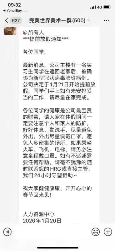1月21日消息,今日网传完美世界$(002624)$一名实习生感染新型冠状病毒肺炎,北京公司因此全员放假。对此,腾讯新闻《一线》向完美世界求证,截至发稿,暂无回应。