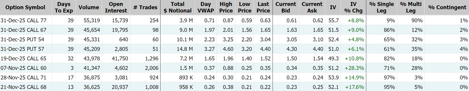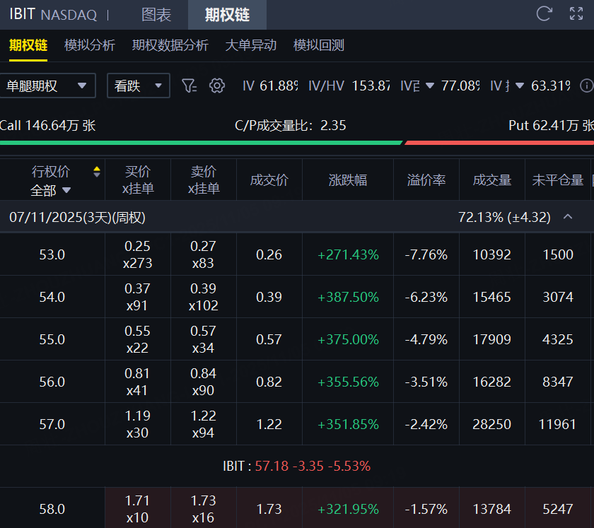 期权方面,iShares Bitcoin Trust ETF当日期权成交逾200万张,较90日均量放大近3倍,看涨期权占比大幅回落,其中于12月31日到期的77美元行使价的远期看涨期权成交居前,成交逾5.5万张;此外,从期权链上看,iShares Bitcoin Trust ETF多张于本周五到期的Put单翻倍大涨。 $IBIT 20251231 77.0 CALL$ $IBIT 20251107 57.0 PUT$