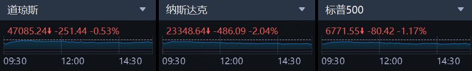 周二,美股三大指数集体收跌,截至收盘,标准普尔500指数跌1.17%,报6771.55点;纳斯达克综合指数跌2.04%,报23348.64点;道琼斯工业平均指数跌0.53%,报47085.24点。