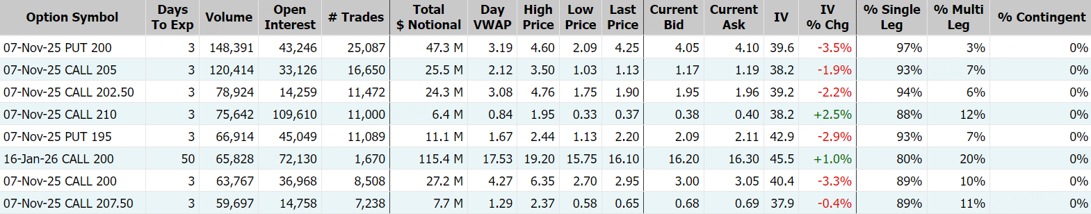 期权方面,英伟达当日期权成交236.5万张,看涨期权占比63.7%,其中于11月7日到期的200美元行使价的看跌期权、11月7日到期的205美元行使价的看涨期权成交居前,分别成交14.84万张、12.04万张。 $NVDA 20251107 200.0 PUT$ $NVDA 20251107 205.0 CALL$