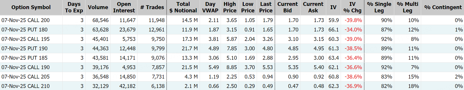 Palantir当日期权成交156.39万张,看涨期权占比56.9%,其中于11月7日到期的200美元行使价的看涨期权、11月7日到期的180美元行使价的看跌期权成交居前,分别成交6.86万张、6.36万张。$PLTR 20251107 200.0 CALL$ $PLTR 20251107 180.0 PUT$