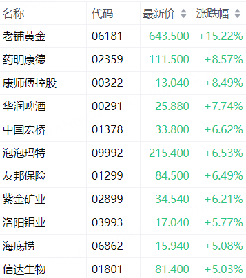 恒指成分股中,老铺黄金涨超15%,药明康德涨超8%。