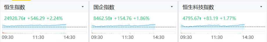 3月24日,港股盘中走高,恒指涨超2%,科指涨1.77%。