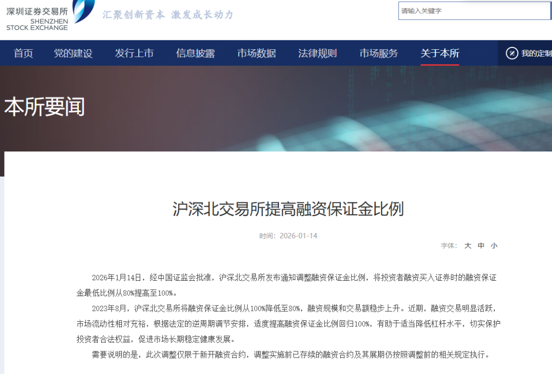 经中国证监会批准,沪深北交易所发布通知调整融资保证金比例,将投资者融资买入证券时的融资保证金最低比例从80%提高至100%。