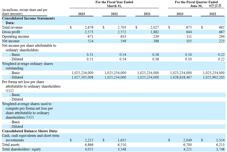 透过一纸招股书,ARM最新营收一览无遗。2021财年至2023财年,ARM年收入分别为20.27亿美元、27.03亿美元、26.79亿美元;净利润则分别为3.88亿美元、5.49亿美元、5.24亿美元。