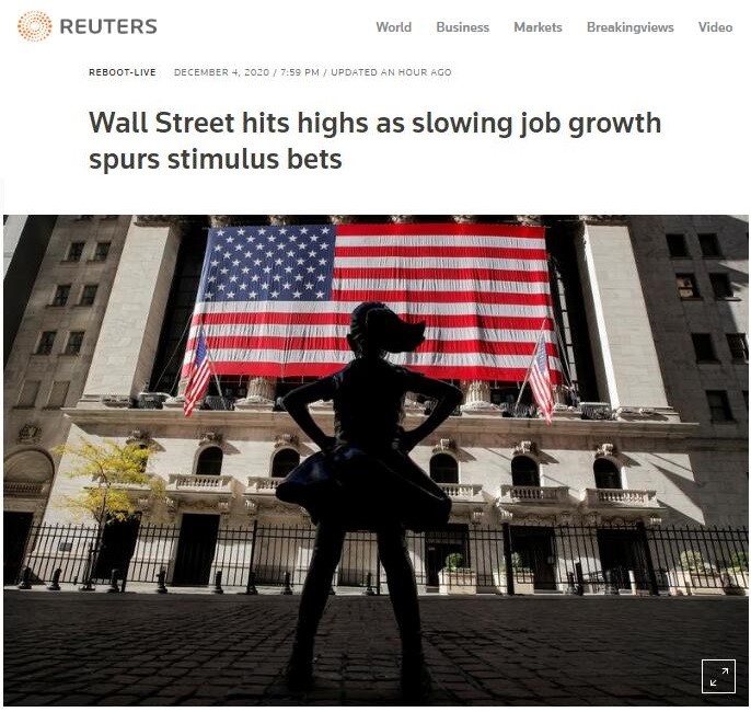 非农就业数据显示,美国11月新增就业人数为六个月来最少,令投资者对出台新财政刺激的期望增加,美国三大股指周五集体收创新高。道指收涨248.74点,涨幅0.83%,标普500收涨0.88%,纳指收涨0.7%。道琼斯交通平均指数和小盘股指罗素2000也都收创新高。 对经济复苏敏感的能源、材料、工业等周期股在标普500成分股中表现突出。因原油上涨,标普500的能源板块大幅收涨5.4%。Diamondback Energy西方石油分别战场12%和13%。 10年期美国国债收益率盘中升破0.98%,创3月以来新高,推动对利率敏感的金融股走高。 波音公布削减787 Dreamliner机型的产量目标,为18个月来第四次下调目标。波音股价跌近2%,在道指成份股中表现最差。