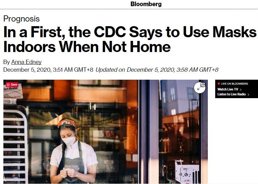 彭博社:美疾控中心首次建议即使不在家中也要在室内戴口罩