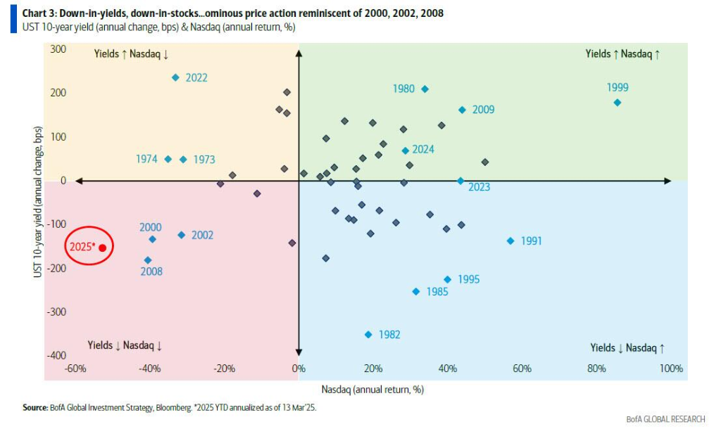 不过,Hartnett也提醒投资者,当前市场“收益率和股票同步下跌”的走势令人担忧,与2000年、2002年和2008年市场崩盘前的情形相似,预示市场可能仍有痛苦。