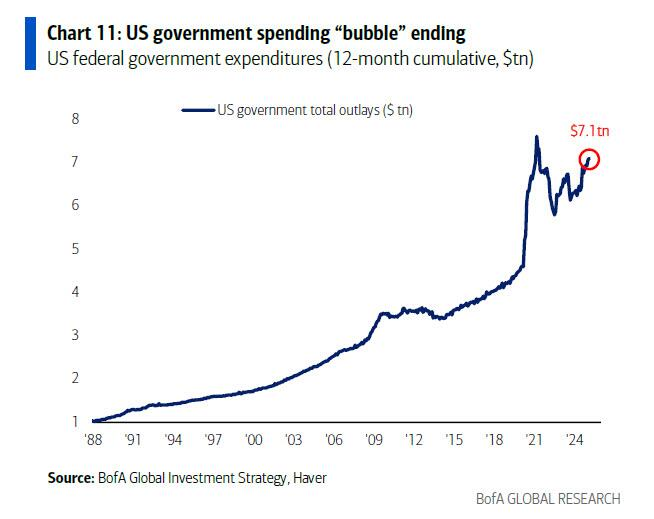 做多债券(LongBonds):Hartnett建议做多30年期美国国债,押注美国收益率曲线牛市趋平。他认为,美国政府支出大幅下降(过去5年增长65%至7万亿美元,过去12个月增长12%)预示着“美国政府衰退”的开始。“投资”和“消费”也面临下行压力,而美国通胀仍高于3%,这意味着美联储在H1无法先发制人地降息,债券收益率下降将成为经济增长的自动稳定器。