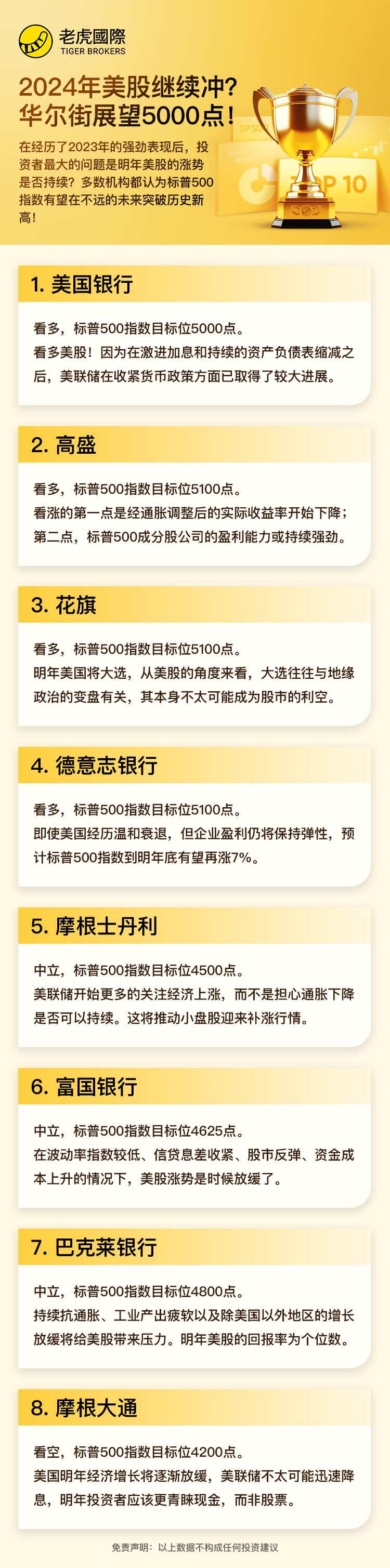 在经历了2023年的强劲表现后,投资者最大的问题是明年美股的涨势是否持续?为此,老虎国际整理了华尔街投行对2024年美股的最新预测,从看空派、中立派以及看多派的视角,探析美股2024年走势。