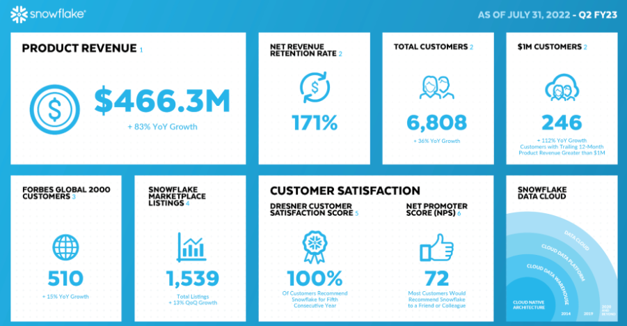 虽然自2021年12月之前,Snowflake销售额连续六个季度同比增长超100%,但今年以来Snowflake增速开始显现疲态,其第一财季产品收入增长84%,本季度产品收入同比增长83%,这将是该公司自2020年上市以来的最低增速,也是该公司产品收入增速连续第二个季度下滑。