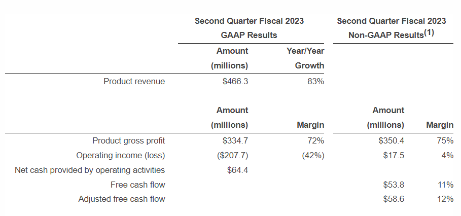 - 第二季度产品收入4.663亿美元,高于分析师预期 4.381亿美元,同比增长83%。